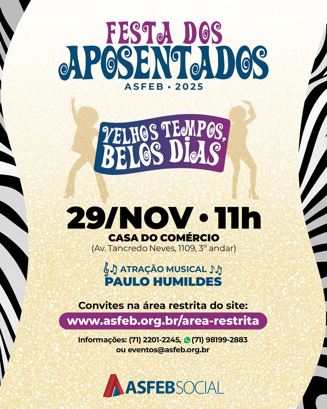 👉 Os convites já estão disponíveis na área restrita do site. Adesões até 18/11 ou enquanto durar o estoque. Acesse: (www.asfeb.org.br/area-restrita/).